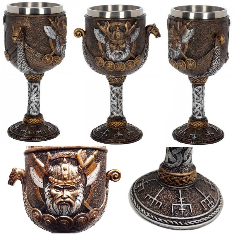 Il Calice è in metallo rivestito in resina dipinta a mano e riproduce nel dettaglio la classica nave vichinga "Drakkar"(o dreki),dalla caratteristica forma di drago,usata sia in battaglia che per seppellire i morti dandole fuoco,dove spicca il volto di Odino incorniciato da asce bipenne;che poggia su una colonna decorata da rune norenne.
