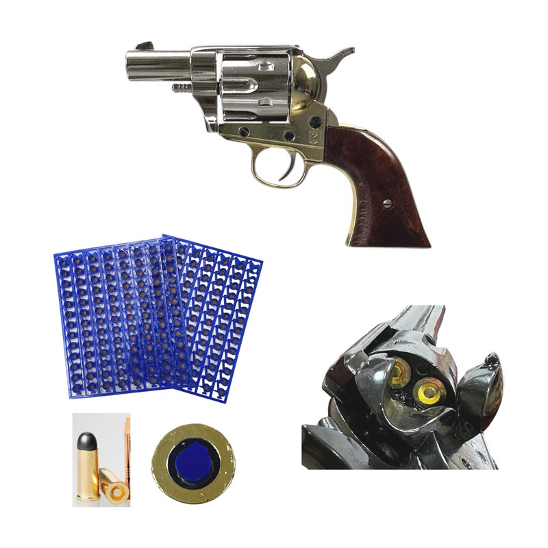 Infine la pistola include una Scatola-Espositore in cartonato color legno con 6 pallottole a salve,